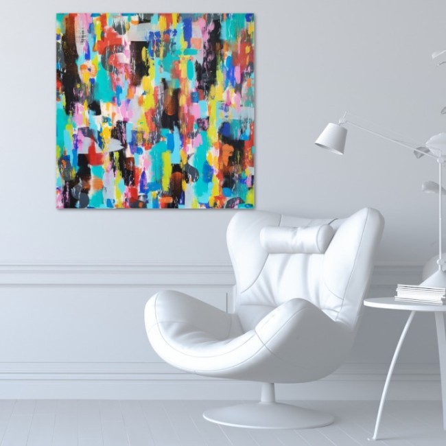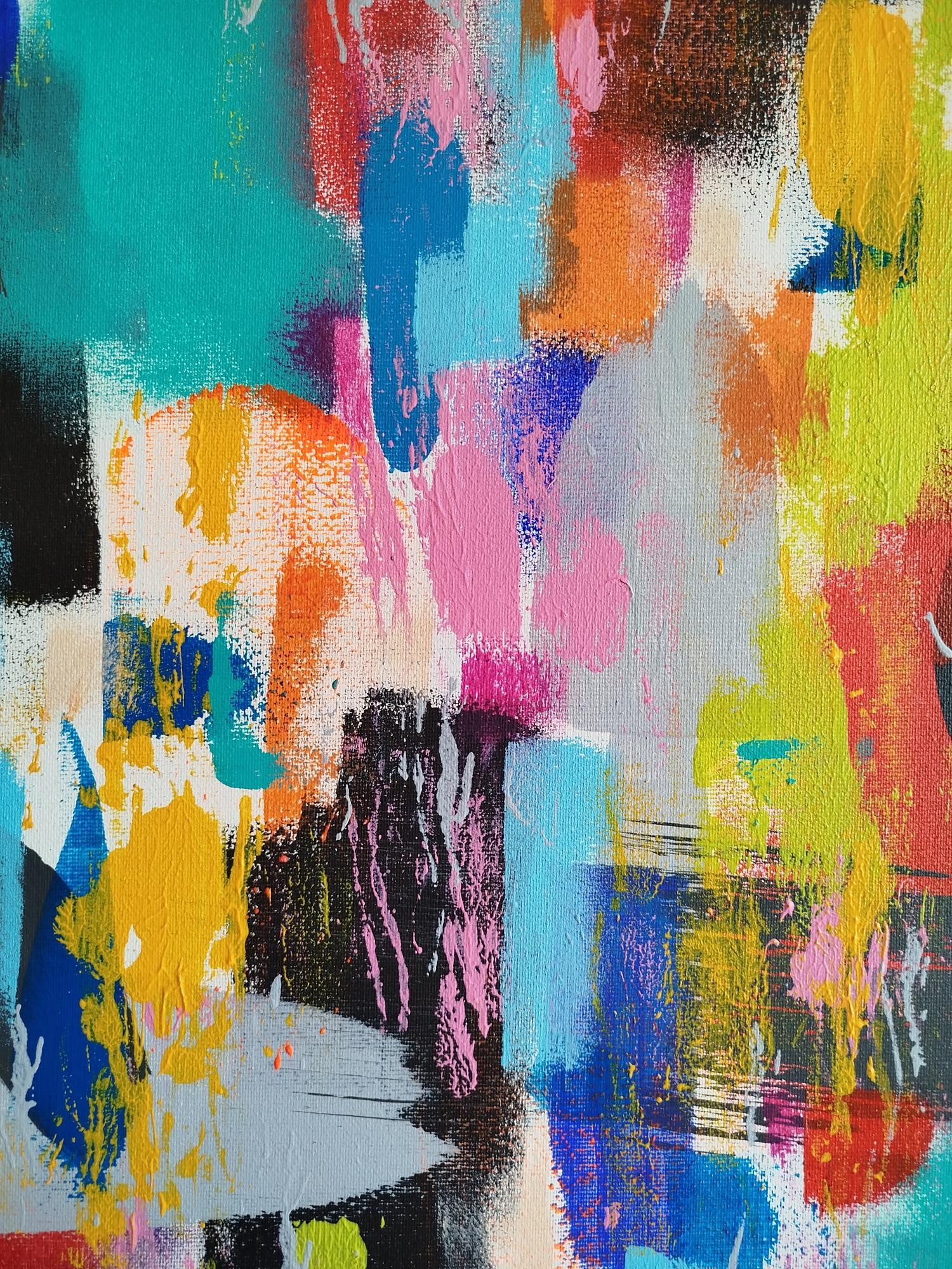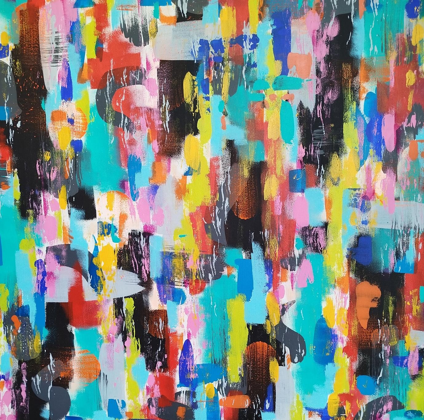 Les couleurs se superposent, créant des effets de profondeur et de dynamisme. Oeuvre abstraite unique et expressive.